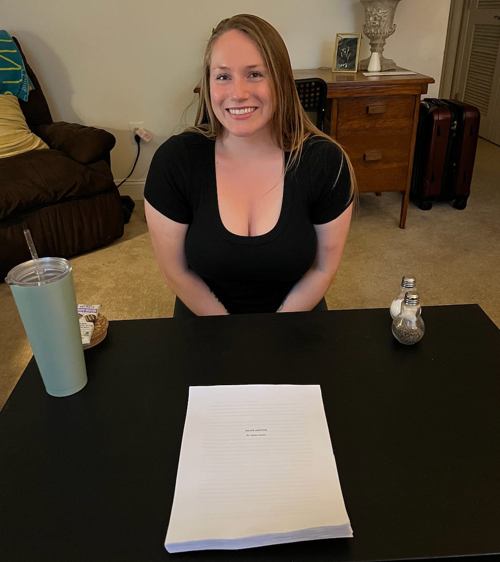 In fact, to illustrate that point, here’s a picture of me the first time I printed out my novel, when I finally finished the FIRST WHOLE DRAFT. For reference, this was in August 2022 – over a year ago!